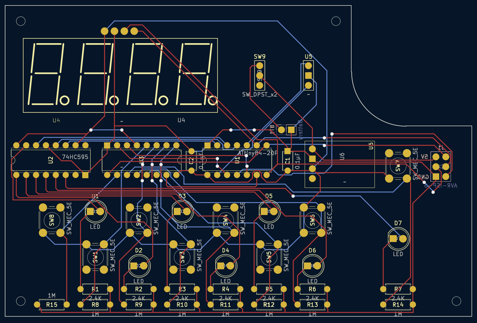 The main components of the board are an ATtiny84 MCU, a CD4532 8-bit encoder, and an SN74HC595 shift register. Initially, I considered using an ATtiny85, but its limited number of pins made it impractical unless I could use I2C for all peripherals, which wasn’t feasible. The shift register controls the LEDs for the buttons, while the encoder allows the device to support eight buttons using only four MCU pins (three for encoding the value and one for interrupts).